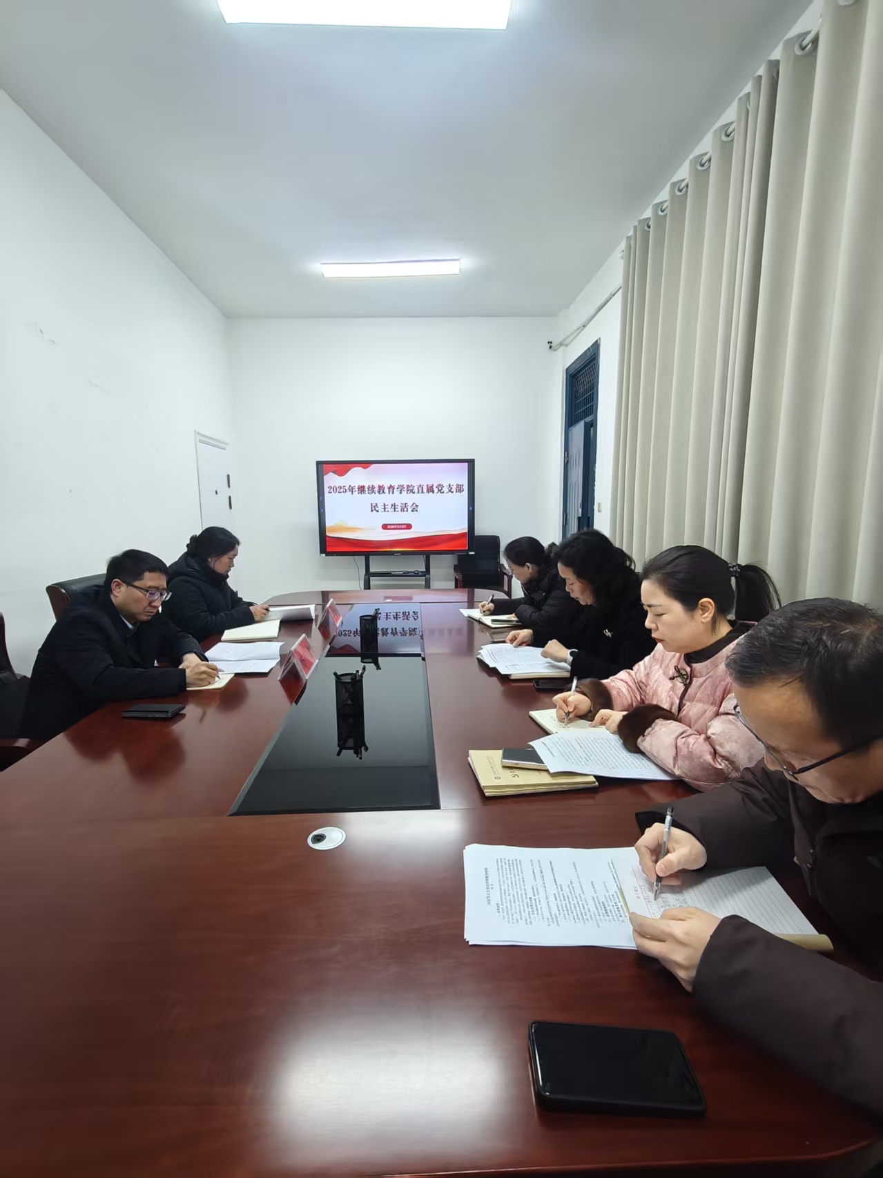 按照学校党委统一部署和要求,3月3日上午,继续教育学院直属党支部召开2025年度民主生活会。校党委督导组成员杨智、浦海涛到会指导。会议紧扣深入学习贯彻习近平新时代中国特色社会主义思想,落实中央八项规定精神,以高质量党建引领继续教育事业高质量发展的主题,结合学院实际,深入开展对照检查、批评与自我批评,为推动学院转型发展凝聚思想共识。