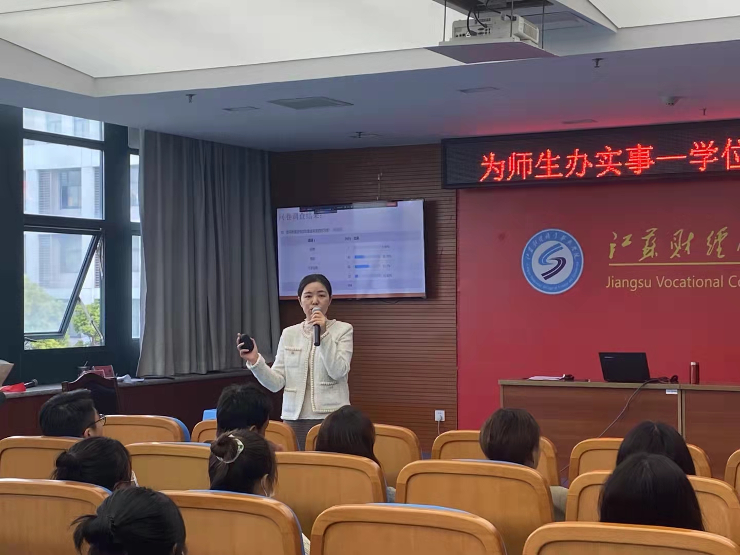 在继续教育学院副书记朱磊的指导下,我院教师赵娜开设关于学位英语考试以及四级考试的专项讲座。讲座伊始,朱磊向各位同学讲述了此次活动的目的就是为了帮助同学们解决本科段学习中,尤其英语课程学习中所遇到的问题,如果遇到其他学习问题都可提出,并表示学院一定会认真对待并努力解决同学们提出的问题。