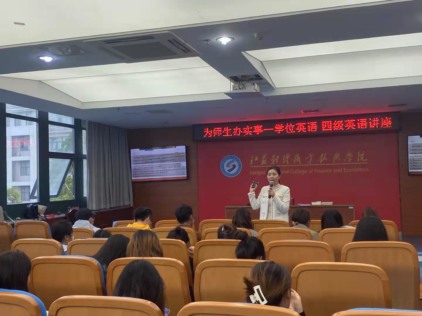 讲座中,赵娜根据自己多年的教学经验,结合对英语(二)、四级考试题型的深入分析,详细地向同学们讲解了如何巧学英语,精准有效的提高答题准确率。如:阅读理解技巧传授,四级词汇串联记忆、根据上下文逻辑推测词义、根据所给词感情色彩推断作者态度观点等等。
