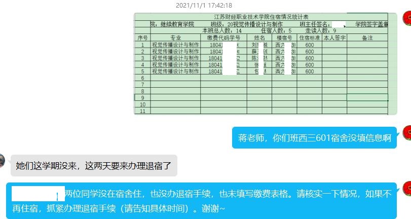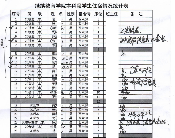 在此次检查中,再次对继续教育学院20本科段住宿学生分宿舍、到床铺进行仔细认真的逐一核对工作,发现部分学生存在申请住宿但并未住宿、以及未及时退宿等情况,检查后第一时间与相关班主任、学生进行核对工作,及时更新公寓管理系统,确保继续教育学院住宿信息准确无误。