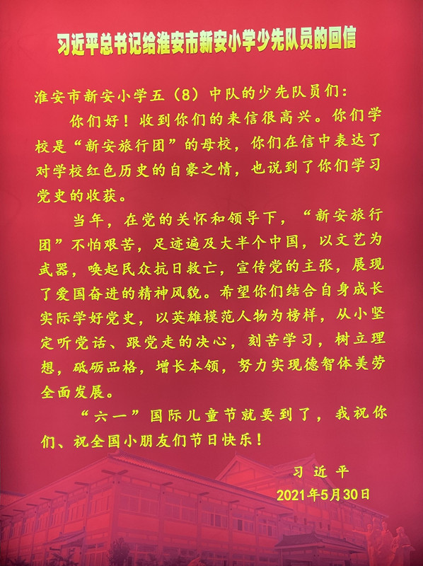 在今年庆祝中国共产党成立100周年之际,习近平总书记在给新安小学的回信中写道:当年,在党的关怀和领导下,“新安旅行团”不怕艰苦,足迹遍及大半个中国,以文艺为武器,唤起民众抗日救亡,宣传党的主张,展现了爱国奋进的精神风貌。希望你们结合自身成长实际学好党史,以英雄模范人物为榜样,从小坚定听党话、跟党走的决心,刻苦学习,树立理想,砥砺品格,增长本领,努力实现德智体美劳全面发展。