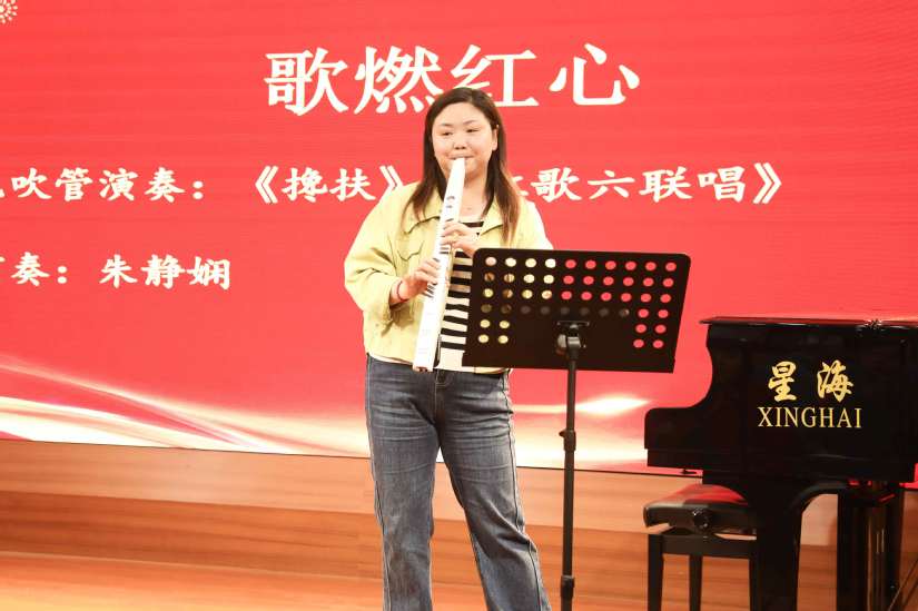 随后,朱静娴带来的电吹管演奏将现场气氛推向高潮。她演奏的《搀扶》和《红歌六联唱》,曲调激昂,红歌的经典旋律唤起了人们心中的红色记忆。演奏过程中,台下观众不时随着节奏轻轻摆动身体,沉浸在音乐的魅力之中。
