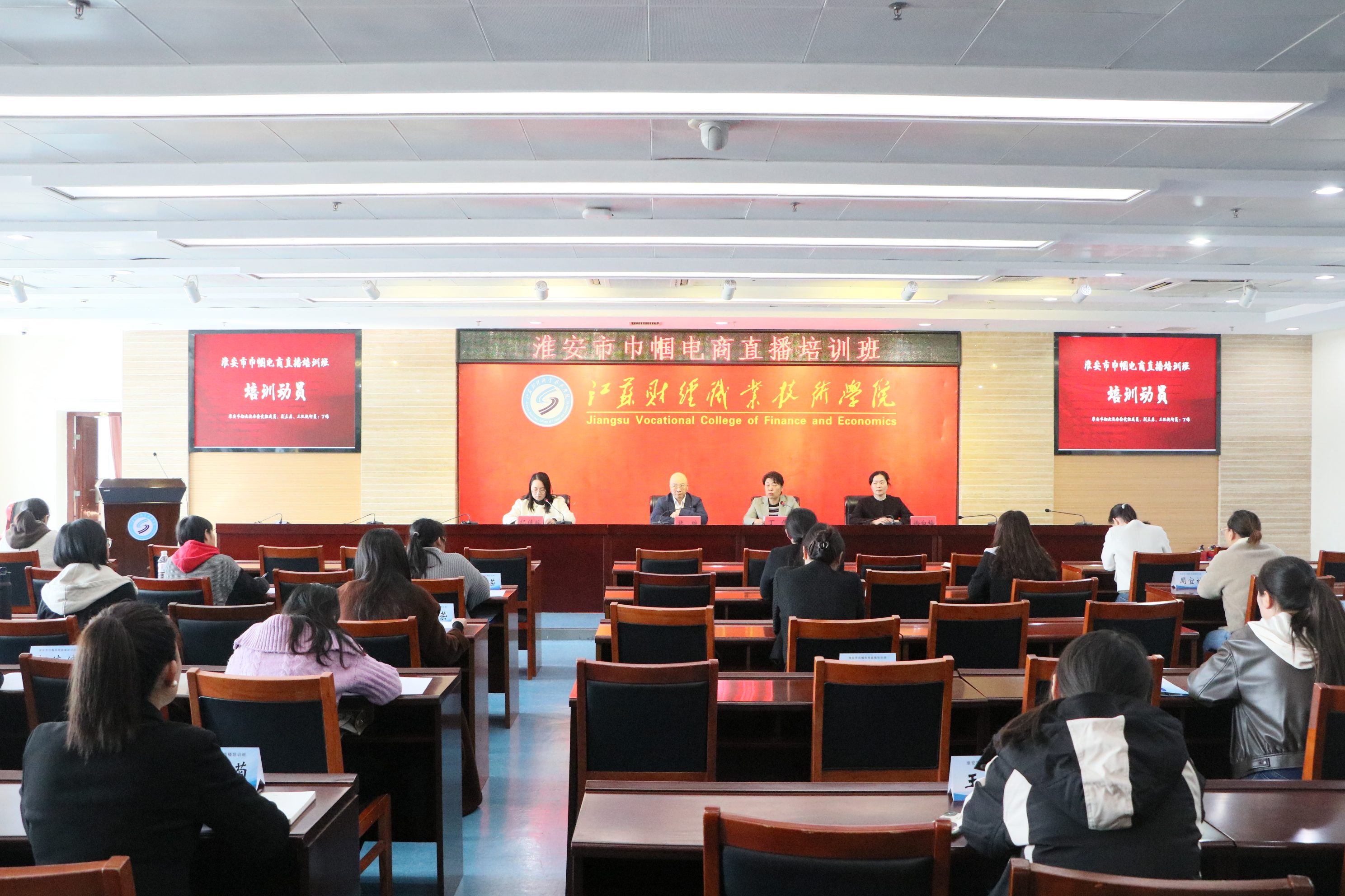 金秋十月,硕果盈枝。2025年10月22日,由淮安市农业农村局、淮安市妇女联合会主办、江苏财经职业技术学院承办的“淮安市巾帼电商直播培训班”,在江苏财经职业技术学院图书馆第一会议室正式开班。淮安市妇女联合会党组成员、副主席、三级调研员丁伟作培训动员,江苏财经职业技术学院党委副书记、校长张维,淮安市农业农村局科教处处长刘汉松分别作专题报告。来自全市各县区的乡间巾帼主理人、巾帼新农人和女村播等40余名优秀女性代表参加培训。