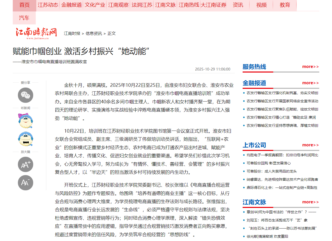 金秋十月,硕果满枝。2025年10月22日至25日,由淮安市妇女联合会、淮安市农业农村局联合主办,江苏财经职业技术学院承办的“淮安市巾帼电商直播培训班”成功举办。来自全市各县区的40余名乡间巾帼主理人、巾帼新农人和女村播齐聚一堂,在为期四天的理论研学、实操演练与实战检验中淬炼电商直播硬本领,为淮安乡村振兴注入强劲“她动能”。
