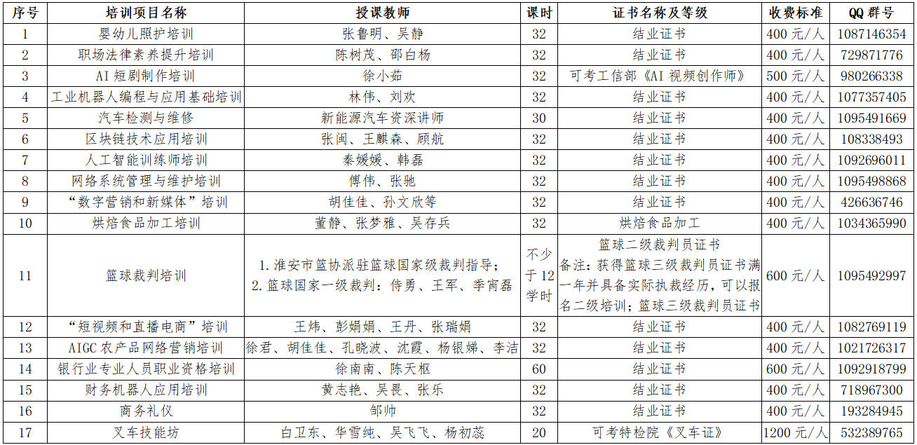 “人工智能训练师培训”是我校面向社会开展的职业技能等级培训项目,首期计划招生 40 人,主要面向零基础、基础薄弱,以及备考人工智能训练师五级(初级)、四级(中级)的社会人员、应届毕业生与在岗从业者。项目严格紧扣人社部考试核心考点,全程共32 课时,理论与实操各 16 课时,比例 1:1,循序渐进覆盖AI 通用基础、五级技能、四级技能三大核心模块,无超纲知识点,兼顾备考通关与实操能力。培训系统讲授人工智能训练师职业认知、法律法规与数据合规、数据标注、数据预处理、数据治理、简易模型训练、标注质量管控等核心内容,通过数据清洗、文本 / 图像 / 语音标注、标注工具实操、简易模型训练、考点刷题、模拟考核等标准化实战训练,让学员快速掌握人工智能训练师上岗必备技能,顺利通过等级考试,具备上岗就业能力,提升职业竞争力,拓宽就业发展渠道。